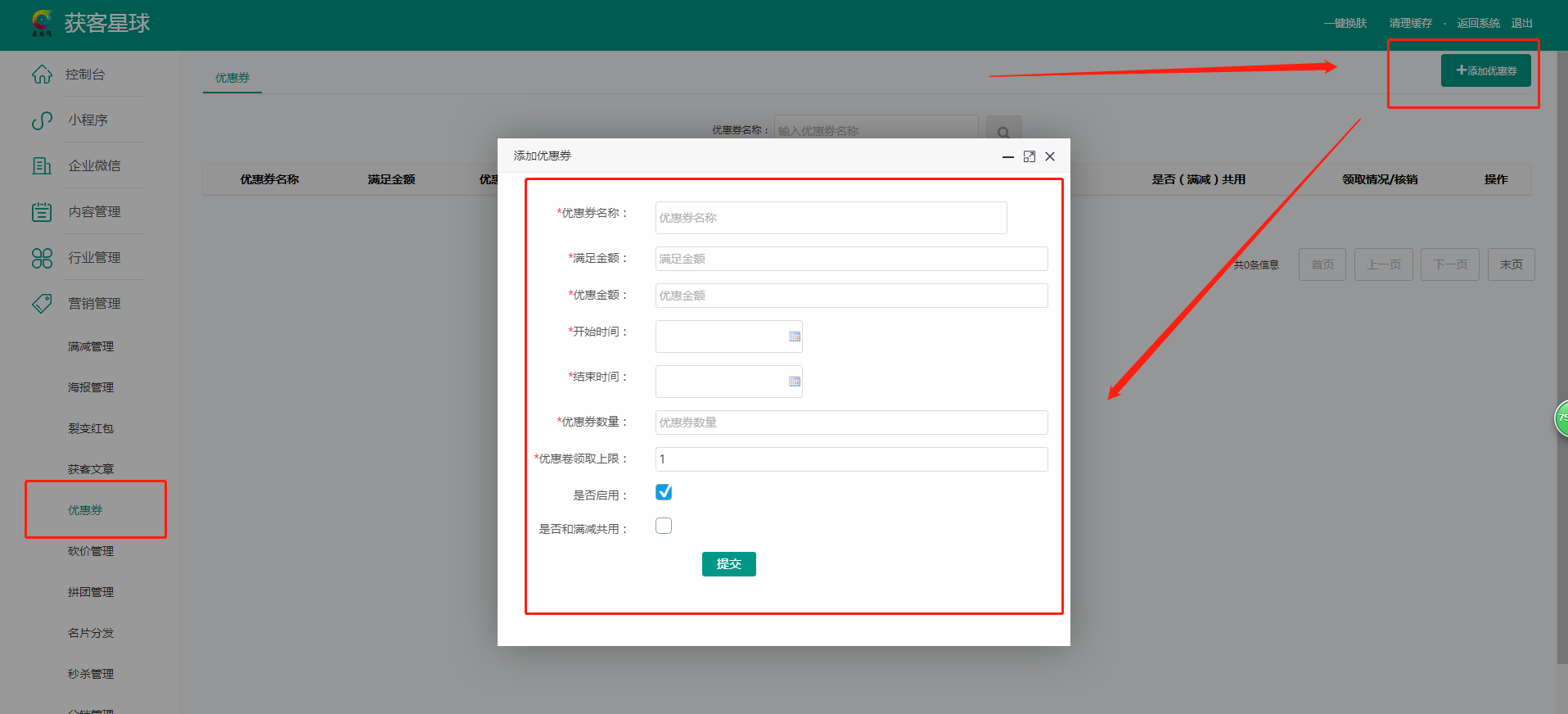 ### 优惠券 添加优惠劵  这里可以查看所有的优惠券信息,新增优惠券,以及对已经有的优惠券进行管理。