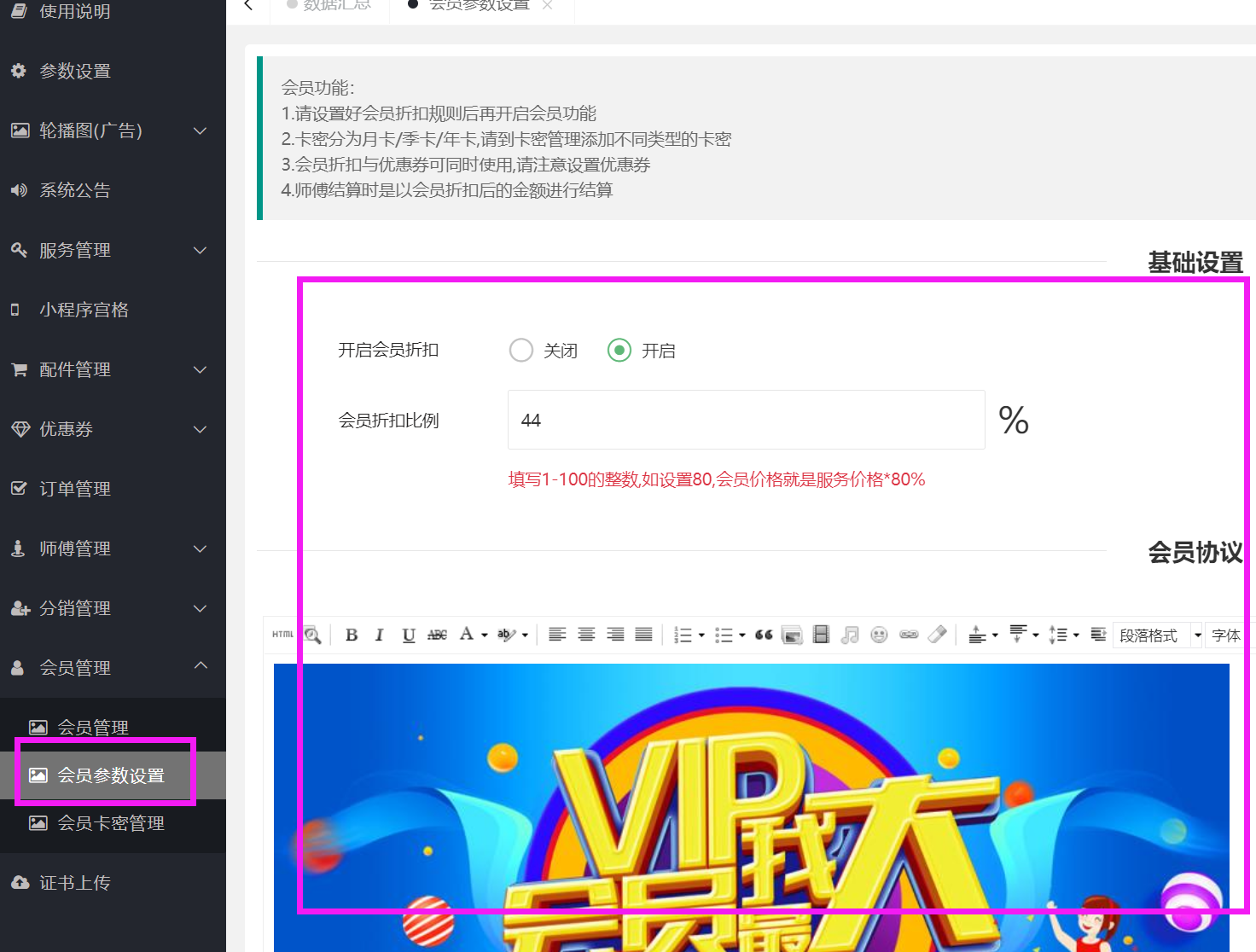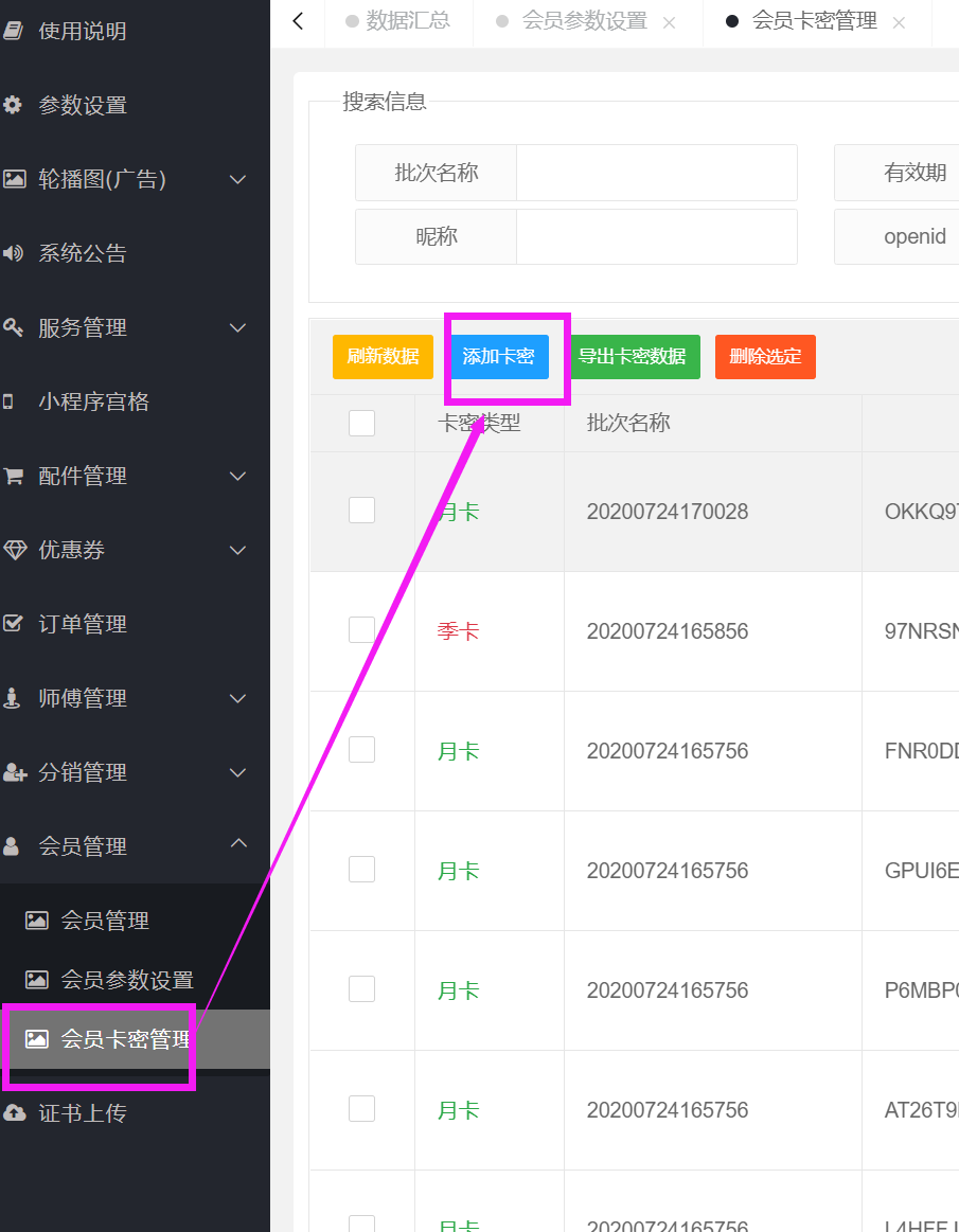 卡密功能使用说明(会员月卡/季卡/年卡/) ## 一、 版本要求 请将未来鸟引擎更新到2.6.3以上,模块版本更新到4.0.4以上 ## 二、 后台设置 在会员管理-会员参数设置里 设置好会员折扣比例 会员协议(可写入领取方法,使用说明等) 会员协议里不要体现充值 购买等字样(有这些字样的会被认为是虚拟支付,审核不过),建议写 联系客服领取卡密等  ## 三、 卡密生成 点击卡密管理 添加卡密  填写批次名称方便记忆(不填写的话会默认填写日期时间)卡密类型 一次生成的卡数量  ## 四、 卡密导出  导出文件请用excel打开 ## 五、 绑定卡密 绑定入口在 项目详情和个人中心均有绑定按钮 ## 六 、 会员折扣与优惠券 服务项目先计算出会员折扣,再进行优惠券计算 ## 七、 技师结算 技师是根据会员折扣后的价格进行结算(与优惠券无关) 比如服务项目100元,会员折扣95%,优惠券10元, 平台扣除技师10% 技师获得金额= 100*95%*(1-10%)= 85.5元